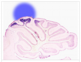 活性化したグリア細胞からはグルタミン酸が放出され、近くの神経細胞の活動が高まった。画像1は、神経細胞が活動した時のマーカー(青)で小脳組織を染めたものであり、光を照らした辺りで神経活動が上がっていたことを示している。