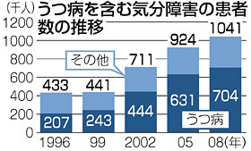 うつ病を含む気分障害の患者数の推移 精神科や心療内科は近年になって急増。1996年から2008年で2.4倍に増えた。これに合わせるかのように、うつ病患者も99年の24万人から08年には70万人超に増加した。