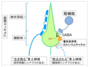 十分な量のカルシウムがないと、シナプスの結合を維持することができないため、やがて、プルキンエ細胞の細胞体にシナプスを持つ登上線維は除去されてしまうのに対し、プルキンエ細胞の樹状突起にシナプスを持つ登上線維は生き残ると考えられるというわけだ(画像)。