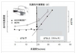 このモデルでは、LT速度を超える走速度で血中乳酸値の急激な上昇が見られると同時に、ストレスの指標となる「ACTH(副腎皮質刺激ホルモン)」や「コルチコステロン(副腎皮質ホルモン)」の分泌も亢進する。
