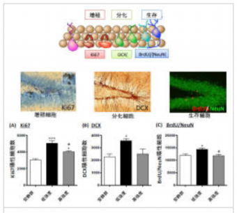 画像2。異なる強度の草運動が海馬神経新生に及ぼす影響。(A)Ki67陽性細胞数、(B)DCX陽性細胞数、(C)BrdU/NeuN陽性細胞数。海馬の神経新生は、ストレスにならない低強度運動により有為に増加した