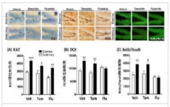 そのため、今回の実験では、アンドロゲン受容体拮抗薬であるフルタミド(Flu)に加え、エストロゲン受容体拮抗薬である「タモキシフェン(Tam)」の効果についても併せて検討された。対照群には、溶媒(Veh)が投与されている。その結果、運動による神経新生の促進効果はFlu群で消失し、その効果は分化細胞や生存細胞において顕著なことが確認された。