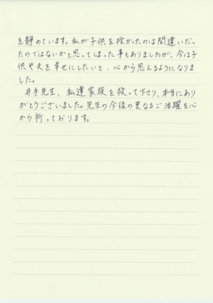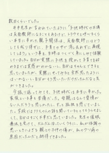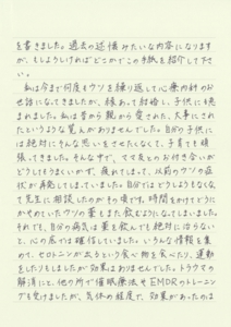 私も先生にご相談する前は、よくある育児ノイローゼや産後うつだとばかり思っていて、色々な所に相談したり本やネットを読んだり、随分と遠回りをしてしまいました。先生の所に行くまでに、たくさん泣いたり悩んだりして、今思うとムダな事もたくさんしてしまいました。私の事を先生のHPの体験談に載せて頂けたら、同じような悩みを持つ方に参考にして頂けるのではないかと思い、お手紙を書きました。過去の述懐みたいな内容になりますが、もしよろしければどこかでこの手紙を紹介して下さい。