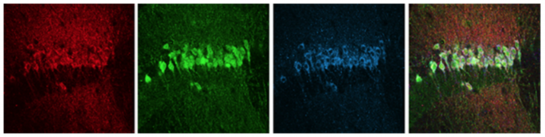 CA2領域の目印となるマーカータンパク質を免疫組織染色法により同時染色した。赤色はRGS14タンパク質、緑色は PCP4タンパク質、青色はSTEPタンパク質を示す。右端は3つの画像を重ね合わせたもので、CA2領域を示す。