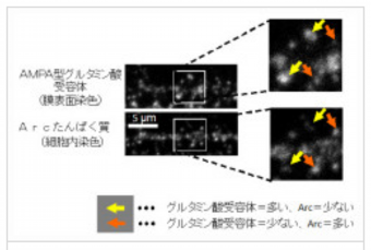 画像2は、神経細胞の樹状突起でのArcタンパク質の発現量とAMPA型グルタミン酸受容体の膜表面での発現量を、多重抗体蛍光染色法を使って比較したもの。シナプスでのArcの量が多い場合には膜表面にあるグルタミン酸受容体の量が少なく、逆に、Arcの量が少ない場合にはグルタミン酸受容体の膜発現量が多いことが明らかになったのである。