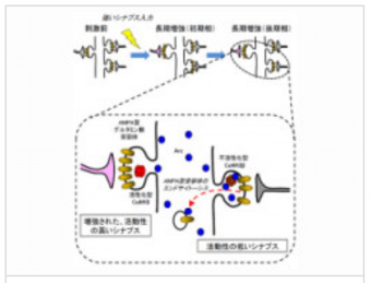 この集積したArcはシナプス膜表面にあるAMPA型グルタミン酸受容体を「エンドサイトーシス」(細胞が細胞外の物質を取り込む過程の1種のこと)により細胞内に取り込む。このようなメカニズムがあれば、増強されたシナプスはArcの影響を受けずに強化されたままで残り、一方、活動性の低いシナプスは意図しないシナプス増強などを防ぐことができる。脳ではこのような巧妙な分子メカニズムによって長期記憶の形成が調節されていると考えられるというわけだ。