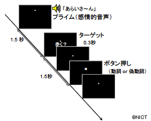 画像1。実験の1例。感情が込められた音声(プライム)を聞いた後、視覚単語(ターゲット)を黙読した場合の被験者の脳活動を解析し、音声に載せられた感情的情報が言語処理にどのような影響を与えるのかを調べた。プライムには、「嬉しい」「悲しい」を表すイントネーションや、平坦(ニュートラル)に発話された「あらいさん」などの人名を用いている。ターゲットには「歩く?」などの動詞や「風ぶ?」などの偽の動詞を用いた。視覚的に文字で呈示されるターゲットは、プライムとは異なり、感情情報を含まない。被験者には、プライムを聞いた後、ターゲットを黙読し、動詞か偽の動詞かを判断してボタン押しで回答する課題を与えた。ターゲットそのものには感情情報は含まれていないが、直前に聞いた感情的音声(プライム)の種類によって、脳内での受け取り方が異なると予想された