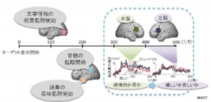 今回の実験では、感情を込めて発せられた音声を聞いた後に、単語を黙読した場合の脳活動の時間経過を計測した。感情的な音声と無感情な音声を聞いた後とを比較すると、単語を黙読した約0.3秒後に右前頭部の脳活動に違いが現れた。