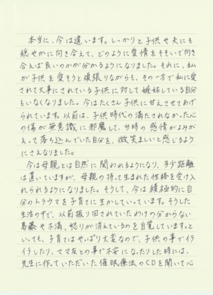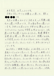 私も先生にご相談する前は、よくある育児ノイローゼや産後うつだとばかり思っていて、色々な所に相談したり本やネットを読んだり、随分と遠回りをしてしまいました。先生の所に行くまでに、たくさん泣いたり悩んだりして、今思うとムダな事もたくさんしてしまいました。私の事を先生のHPの体験談に載せて頂けたら、同じような悩みを持つ方に参考にして頂けるのではないかと思い、お手紙を書きました。過去の述懐みたいな内容になりますが、もしよろしければどこかでこの手紙を紹介して下さい。