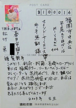 松竹さんから、お礼にとカニ爪をいっぱい頂いたので、そのお返しに肉を贈ったら、このお礼のハガキが届きました。