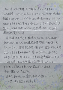 25年間、どうしても自分では止めることができなかったのに、井手先生の催眠療法によって、なぜ過食嘔吐を続けてしまうのかという心の奥の原因に気付かされ、本当に不思議としか言いようがないのですが、自然と「もう止めよう」という気持ちが自分の中で固まり、それが現在も維持されています。