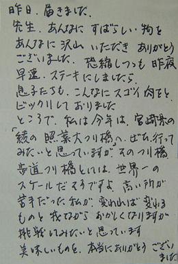 松竹さんから、お礼にとカニ爪をいっぱい頂いたので、そのお返しに肉を贈ったら、このお礼のハガキが届きました。