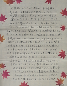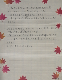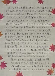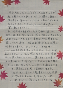 そしてなかなか改善しなくても、焦らないで諦めないでください。努力し続けていると、きっと明るい光が見えてきます。私もそうだったように。少しでも早くいいスタートを切るために、まず初めの一歩を踏み出してもらえたらと心から思います。なぜなら「もっと早く井手無動先生に会えていたら・・・」と思ったからです。先生を信じ、自分を信じてください。すぐそこまで、自分らしい人生が待っていると思うから・・・。このように思えるようになったのも、先生のおかげです。本当に感謝しています。