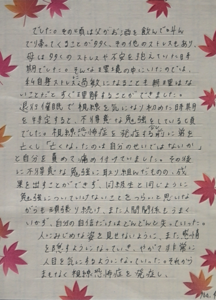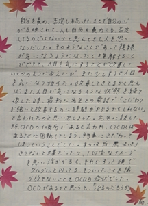退行催眠で視線を気になり始めた時期を特定すると、不得意な勉強をしている頃でした。視線恐怖症を発症する少し前に弟を亡くし「亡くなったのは自分のせいではないか」と自分を責めて痛めつけていました。その後に不得意な勉強に取り組んだものの、成果を出すことができず、同級生と同じように勉強についていけないことをつらいと思いながらも頑張り続け、また人間関係もうまくいかず、自分の自信だけはどんどんと失っていった。人にみじめな姿を見せないように、また感情を隠すようになっていき、やがて非常に人目を気にするようになっていった。それからまもなく視線恐怖症を発症し、自分を責め、否定し続けたことで自分の心が反映されて、人も自分を責めている、否定しているのではないかと思えてきて、人を恐くなりだした。そのようなことがあって視線が気になったと理解することができて、人目を気にすることが改善していくかのようにみえたが、また少しすると人目を気になり始めた。改善してきているかと思えば、また人目が気になるような状態を繰り返し時、最初に先生と電話で「こだわりが強いと改善するのに時間がかかるかもしれない」言われたのを思い出しました。先生に話した所、OCDの傾向があると言われ、OCDとはあることに固執してしまう、物事にこだわってしまうということでした。私は白・黒はっきりさせないと嫌だったり、一回変なイメージを思い浮かべると、それがずっと頭でグルグル回っている、そういったことを振り放せないこともOCDの症状でした。OCDがあるかと思うと、「治るだろうか」と不安になったが、初めて自分自身と向き合い頑張ってこれた。だからここで踏ん張ってやるしかないと自分を奮い立たせて、先生を信じてやってみようと思いました。以前の私でしたら、「やっぱり治るわけがない」と諦めていたことでしょう。それをここで留めさせたのは、催眠暗示CDのこともあったと思います。暗示CDを理性で聞き続けていくことは、つらかったことも多々ありました。治ることを諦めずに聞き続けたことにより、壁や不安に立ち向かうことができるようになり、、悪いことを考え始めると、頭の中にふっとCDの前向きな言葉が浮かんできました。そして少しずつ前向きな自分に変わっていく私がいて、人目を気にする症状も改善していきました。